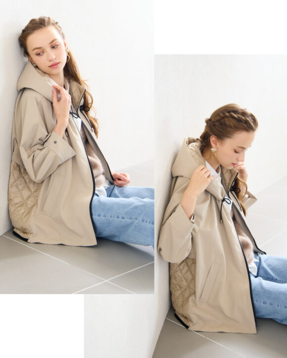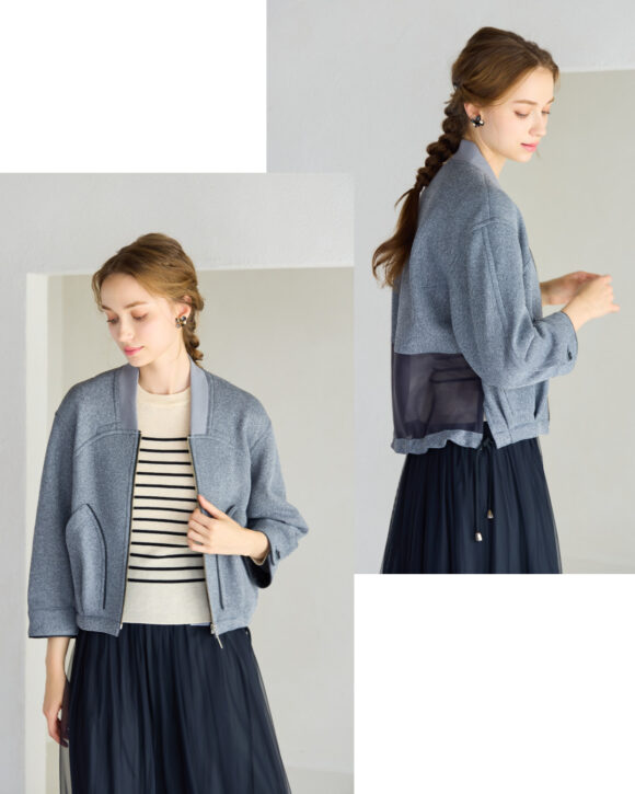 着心地よく軽やかなアウター。異素材使いで単調になりがちなアウターに鮮度をもたらしてくれます。
