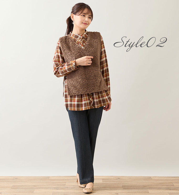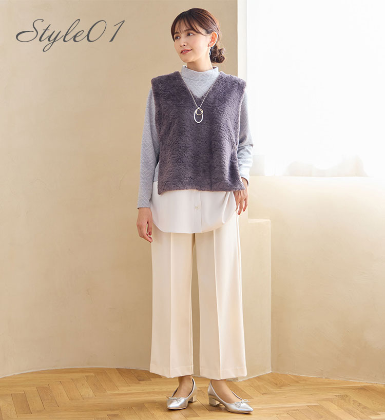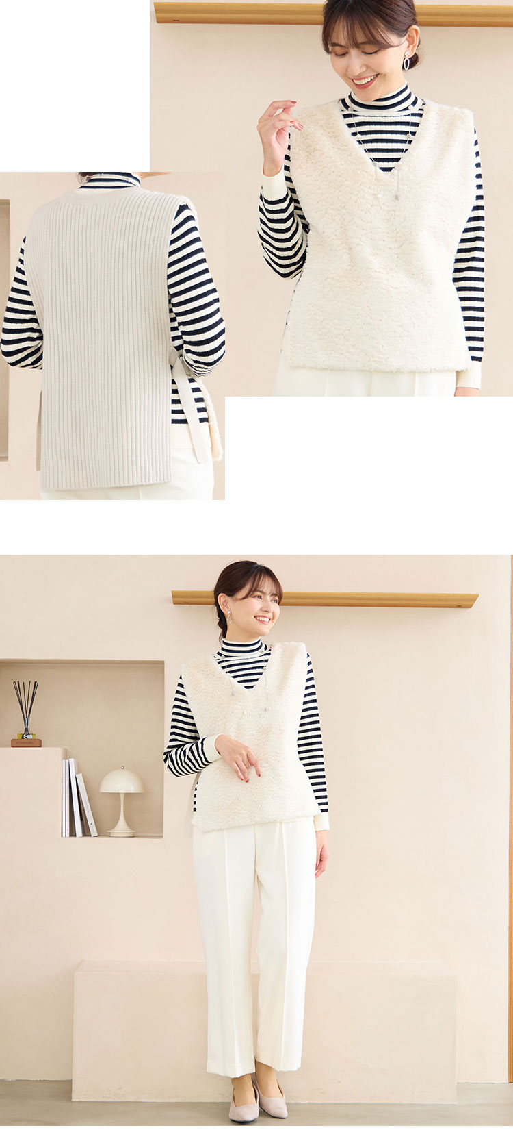 肌触りのいいフェイクファーベストは合わせるインナー次第でカジュアルにも綺麗目にも楽しめるアイテムです。