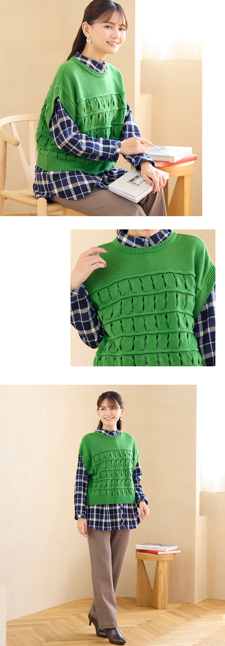 ホールの空いた編地が新鮮なニットベスト。ウール混の暖かみのある風合いで秋冬シーズンにピッタリです。コンパクトな丈で視線を上げてくれるのも嬉しいポイントですね。