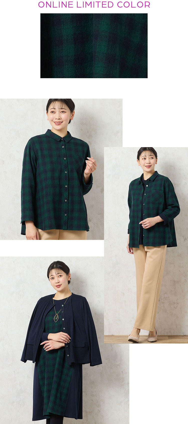 柔らかく温もりのあるウールガーゼを使ったシャツ&ワンピース。深みのあるグリーンをWEB限定カラーとしてご用意しております。