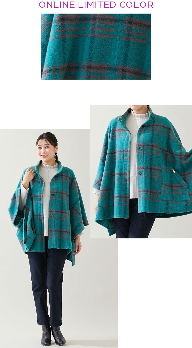 ケープジャケットは纏うだけでこなれ感がアップ!きれいなブルーが限定カラーとなっております。