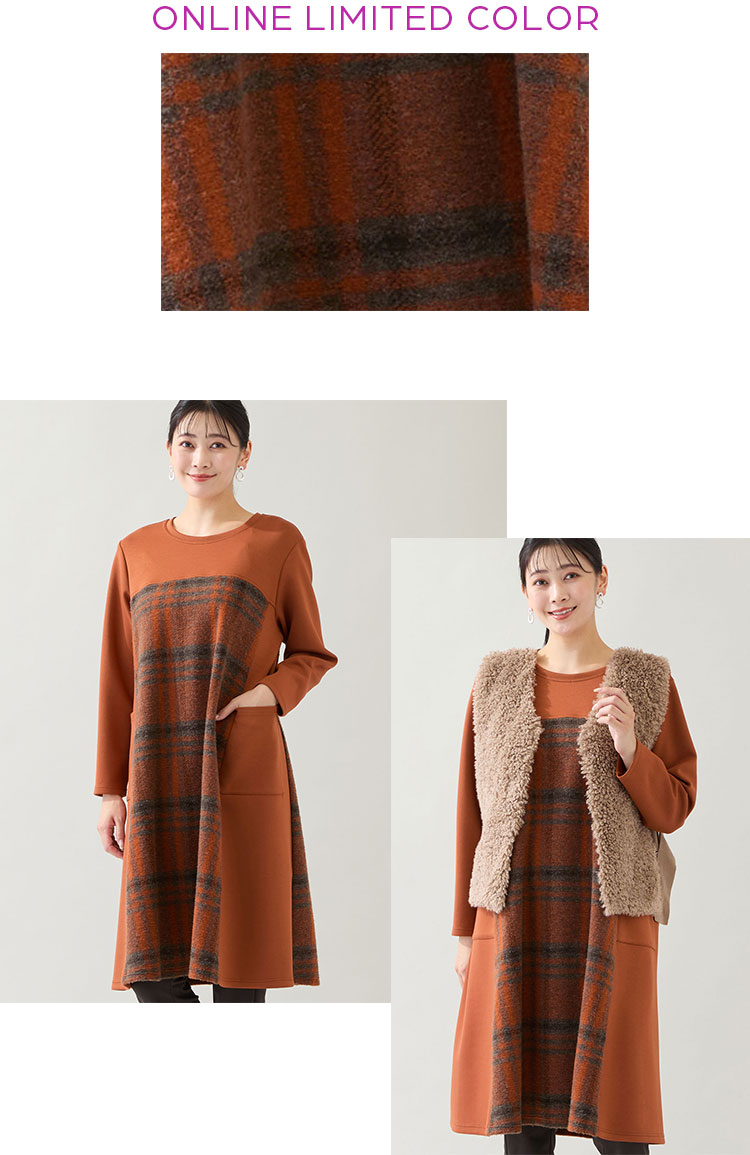 ワンピースはオレンジが限定カラー。明るすぎない色なので着こなしやすく、ファーベストやジャケットとのコーディネートをお楽しみいただけます。