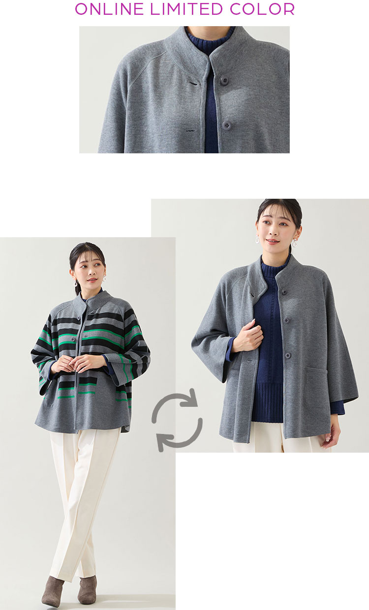 リバーシブルで楽しめるニットカーディガン。限定カラーのグレーは、黒とグリーンのボーダーが効いたシックな配色がオシャレな一枚です。