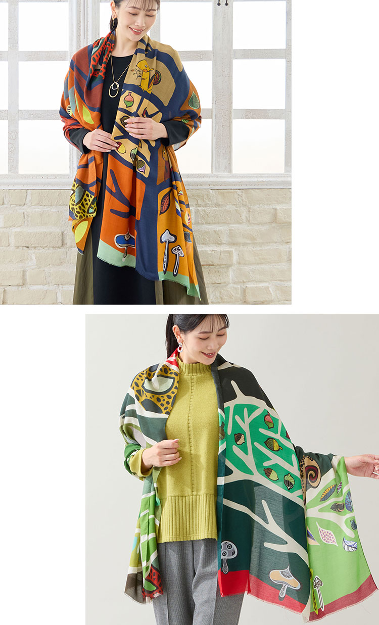 雰囲気のあるカラフルな柄が印象的な大判ストールは全色WEB限定のアイテム。イタリア製ならではの美しい色合いが特徴です。