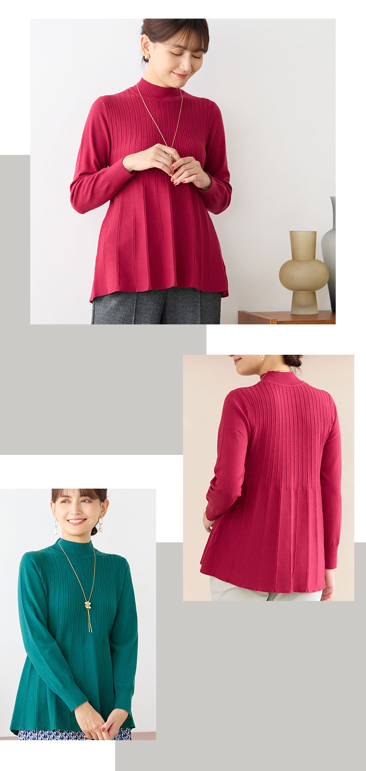 今店頭で売れているこちらのセーター。女性らしいシルエットなので一枚で着映え度抜群です。ふんわりとしたペプラムがお腹周りやヒップラインをカバーしてくれるのも嬉しいポイント。