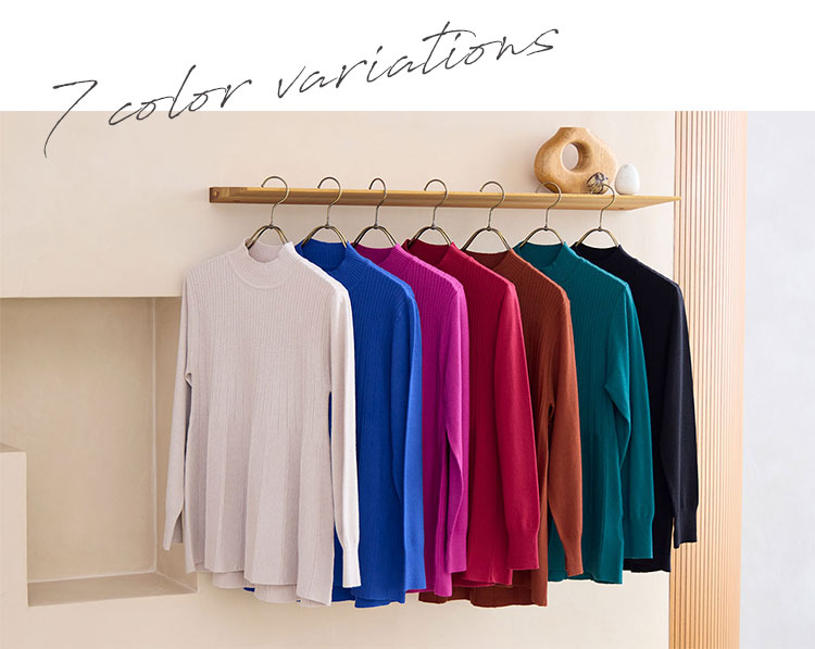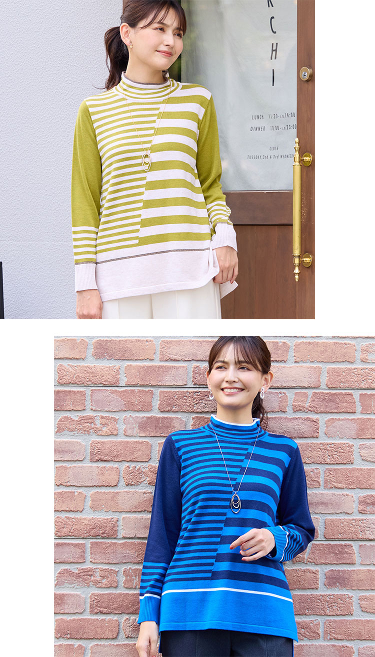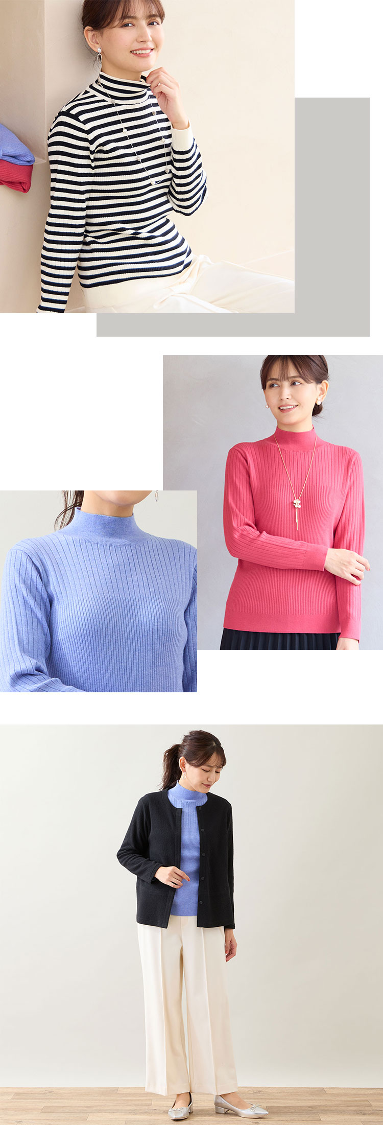 ピッタリしすぎない編地で、胸元からリブの太さを変えたこだわりのリブセーター!きれいなカラー2色とエイジレスなボーダー柄の3色をご用意しております。
