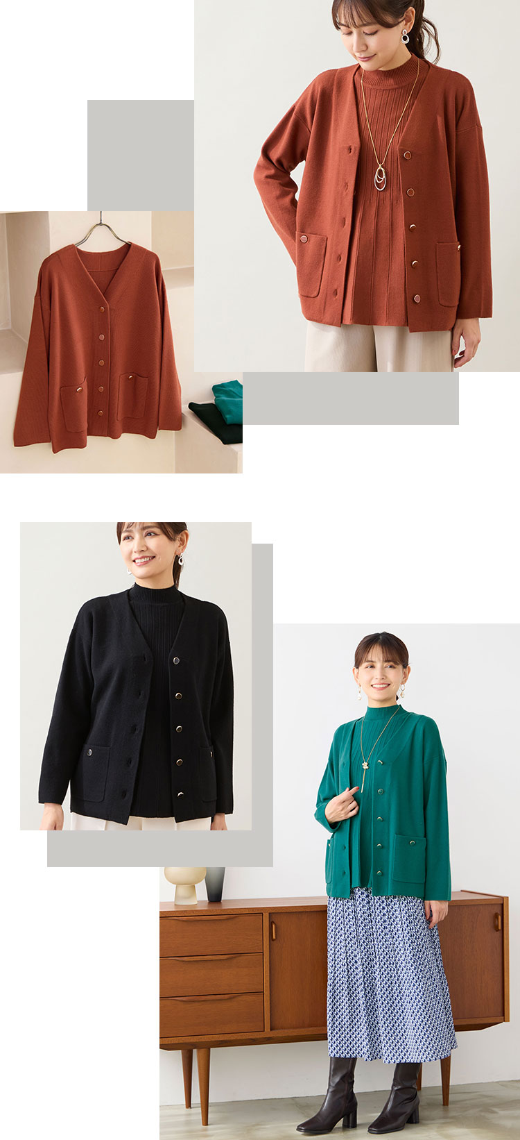 01のセーターとアンサンブルで楽しめるカーディガンもオススメのアイテム!より厚手なので寒い季節も安心です。レトロな甘さのあるボタンも可愛いポイントです。