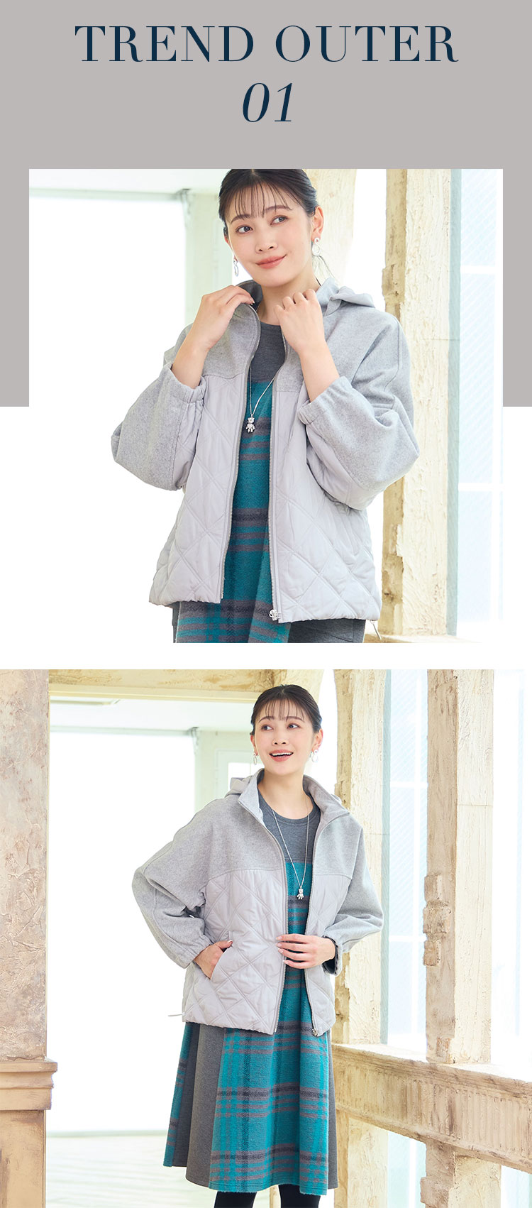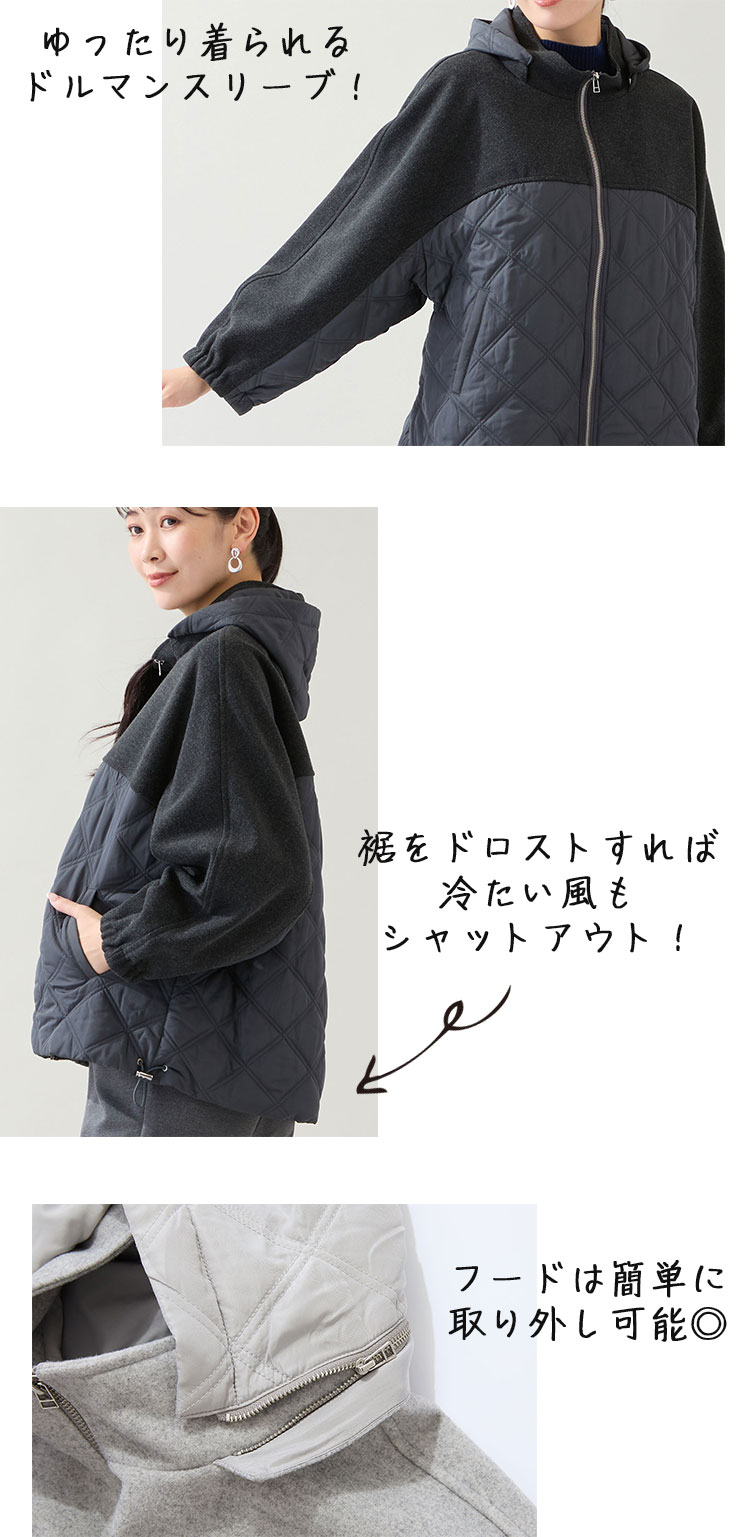 ウール調のジャージーとキルトタフタを組み合わせた異素材使いがお洒落な一枚です。
