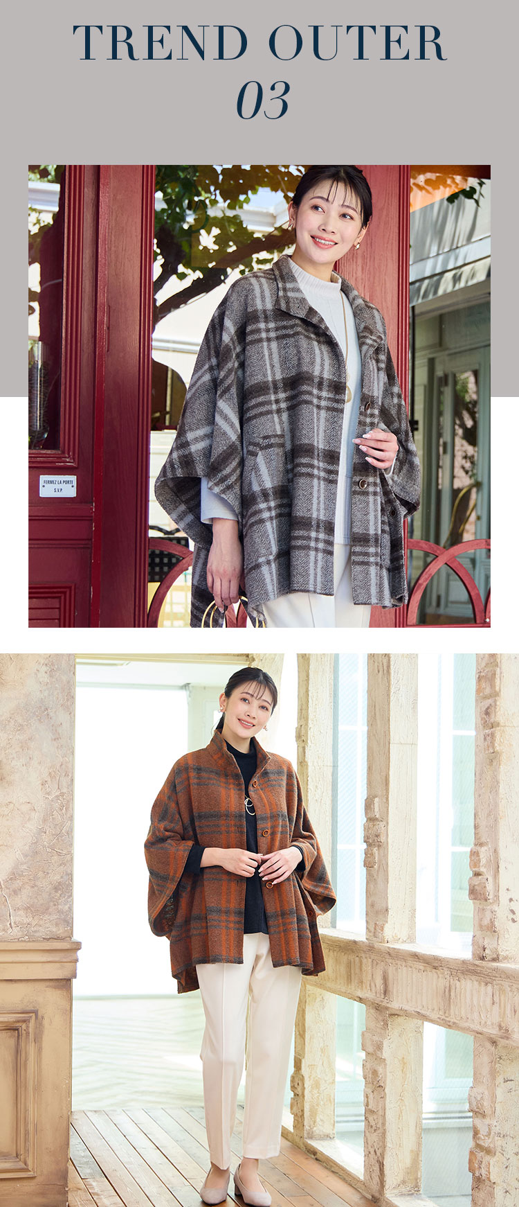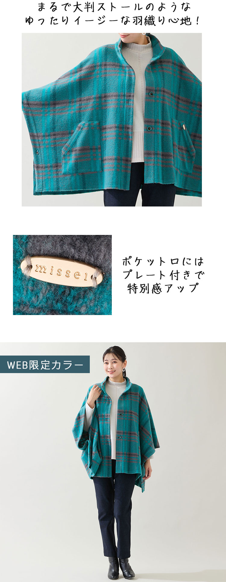 ミゼールの人気アウターといえばこちらのケープジャケット。今年はふんわりと軽いスライバーチェックが新しく仲間入りしました♪