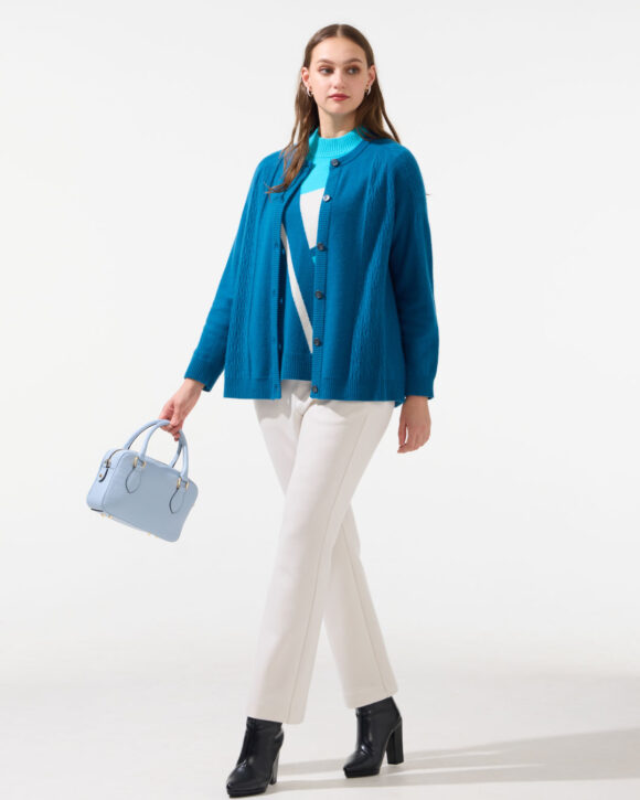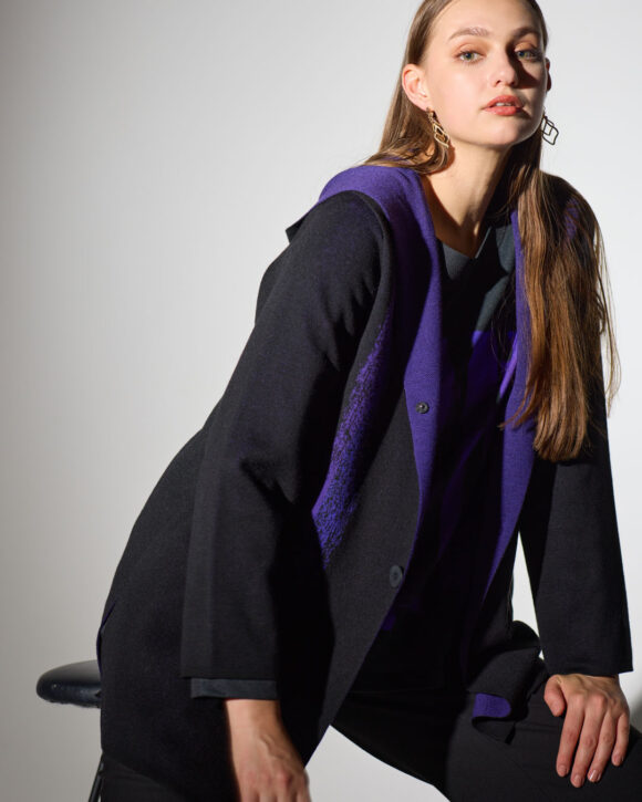室内でも違和感なく着ていられるニットジャケットは中間着として便利なアイテム。