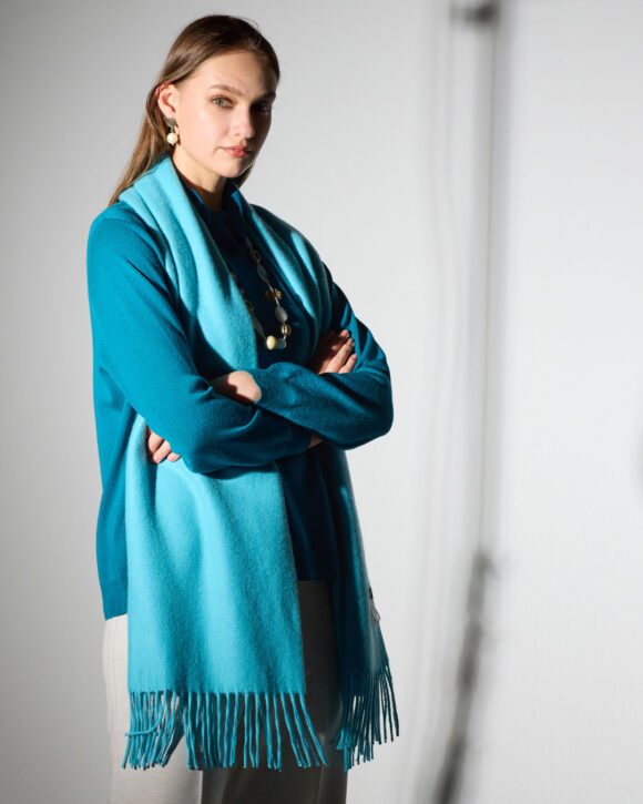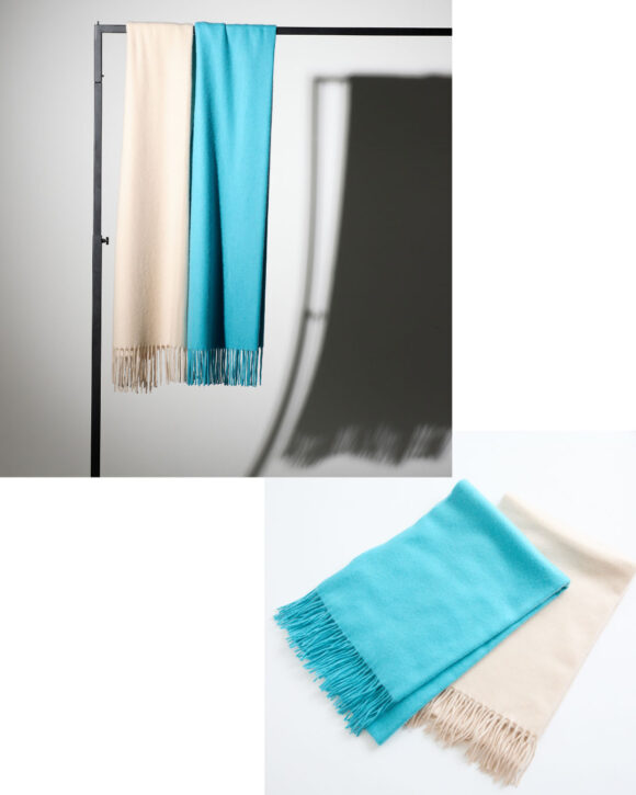 上質感のあるカシミヤストールは頬ずりしたくなるような柔らかさ。手触りよく暖か。
