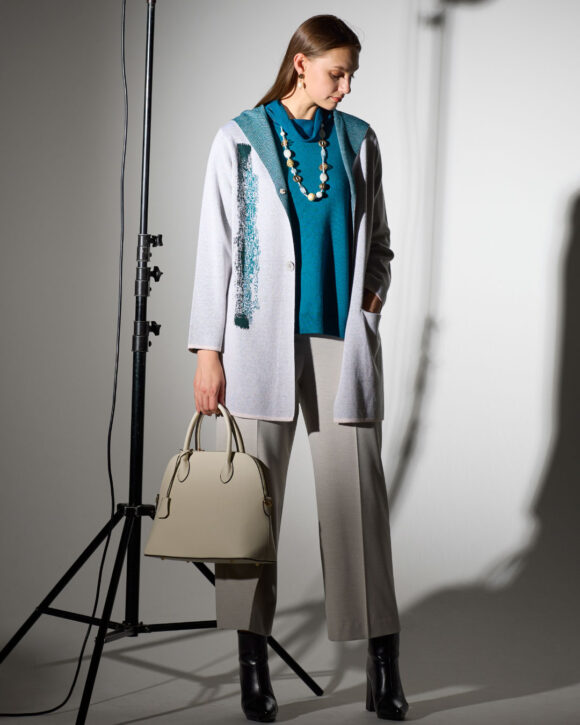 色を合わせたハイネックニットとセットアップで着用するとまとまりのある着こなしに。
