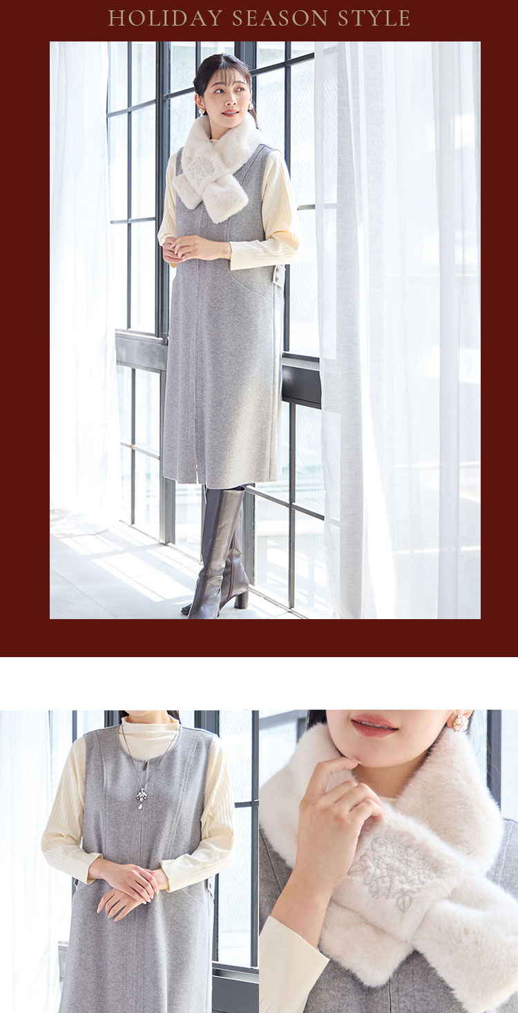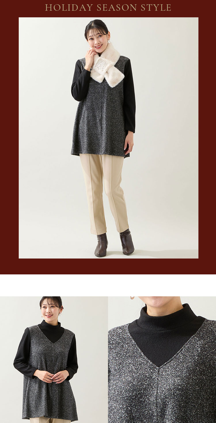 起毛ジャカードシリーズはチュニックも展開中!ファーマフラーを巻けばぐっと華やかな印象でお楽しみいただけます。