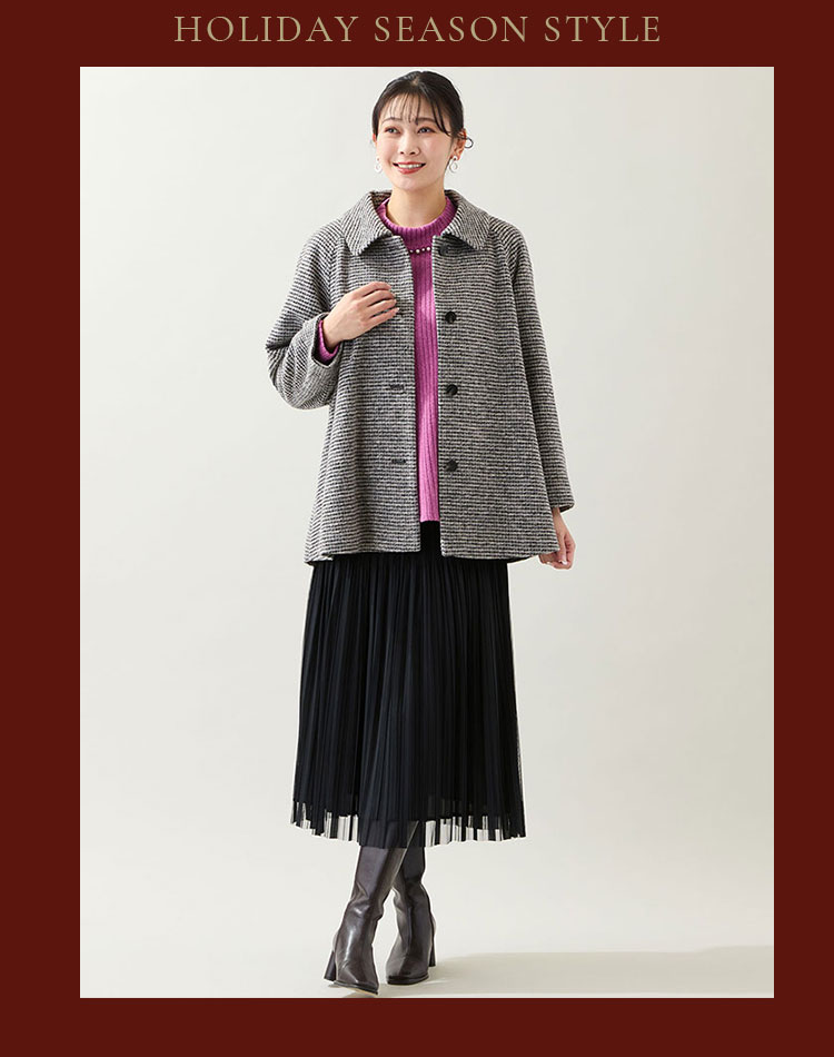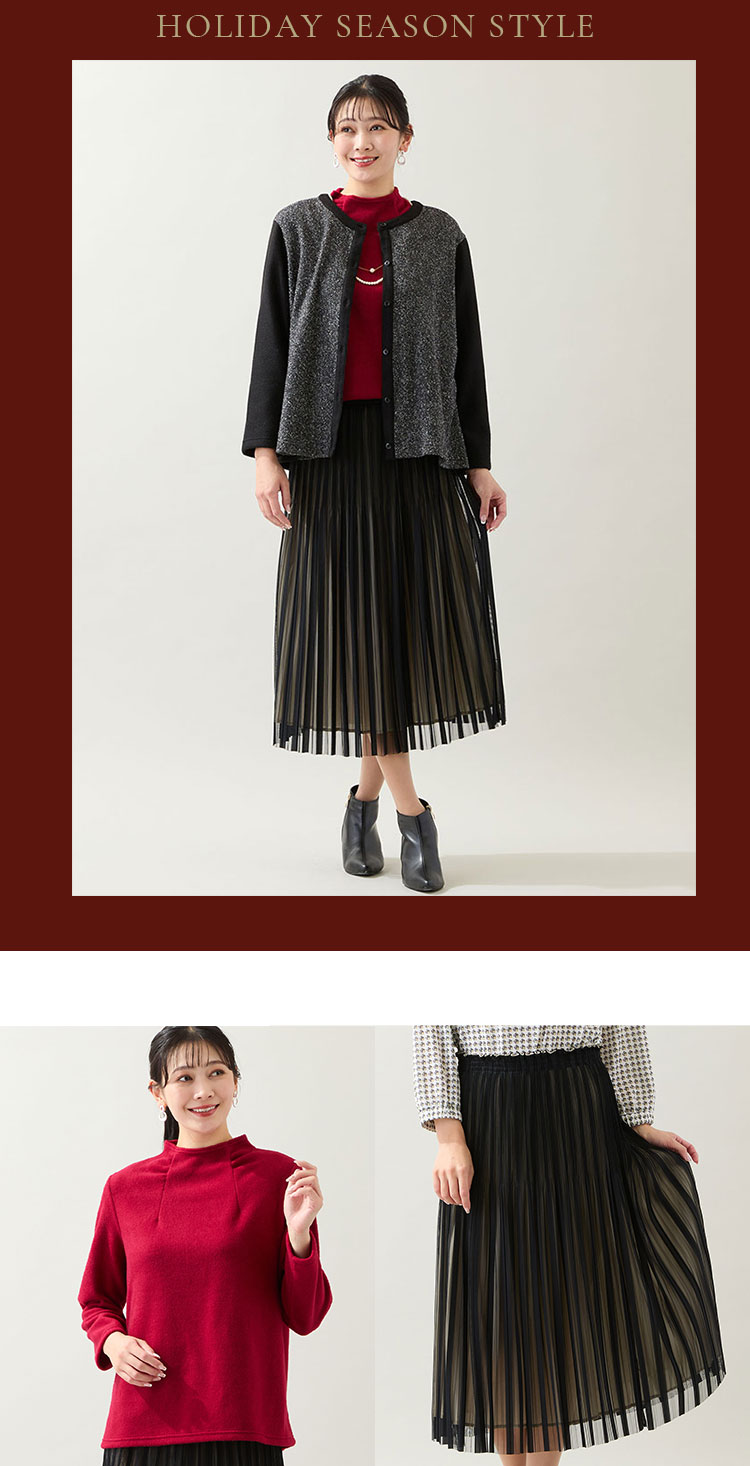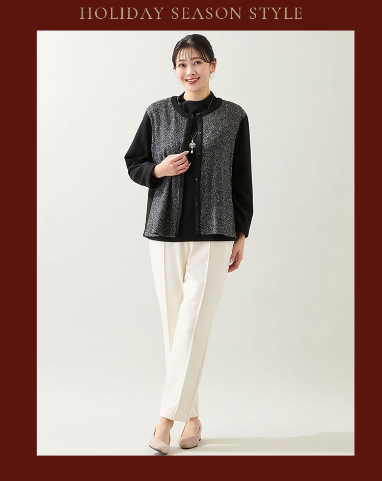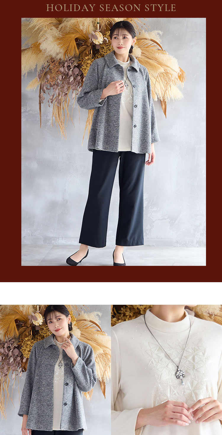 スパンコールが煌めくセーターや上品なツイードトップスを使ったエレガントな着こなしを是非お楽しみください。