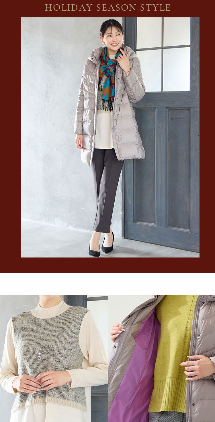 艶やかなダウンコートは着こなしをぐっとエレガントに格上げしてくれる一枚。煌めくスパンコールセーターとの華やぎスタイルはホリデーシーズンにピッタリです。コートは裏地のカラーもポイントです♡