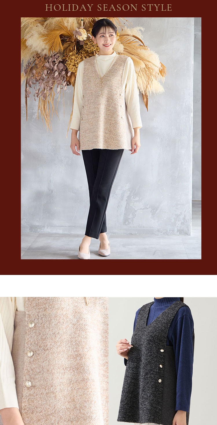 ふわふわのループニットを使ったベストもオススメのアイテム。きちんと感と温もりを兼ね備えており、きれいめなレイヤードスタイルをお楽しみいただけます。サイドのメタルボタンの輝きもポイント!