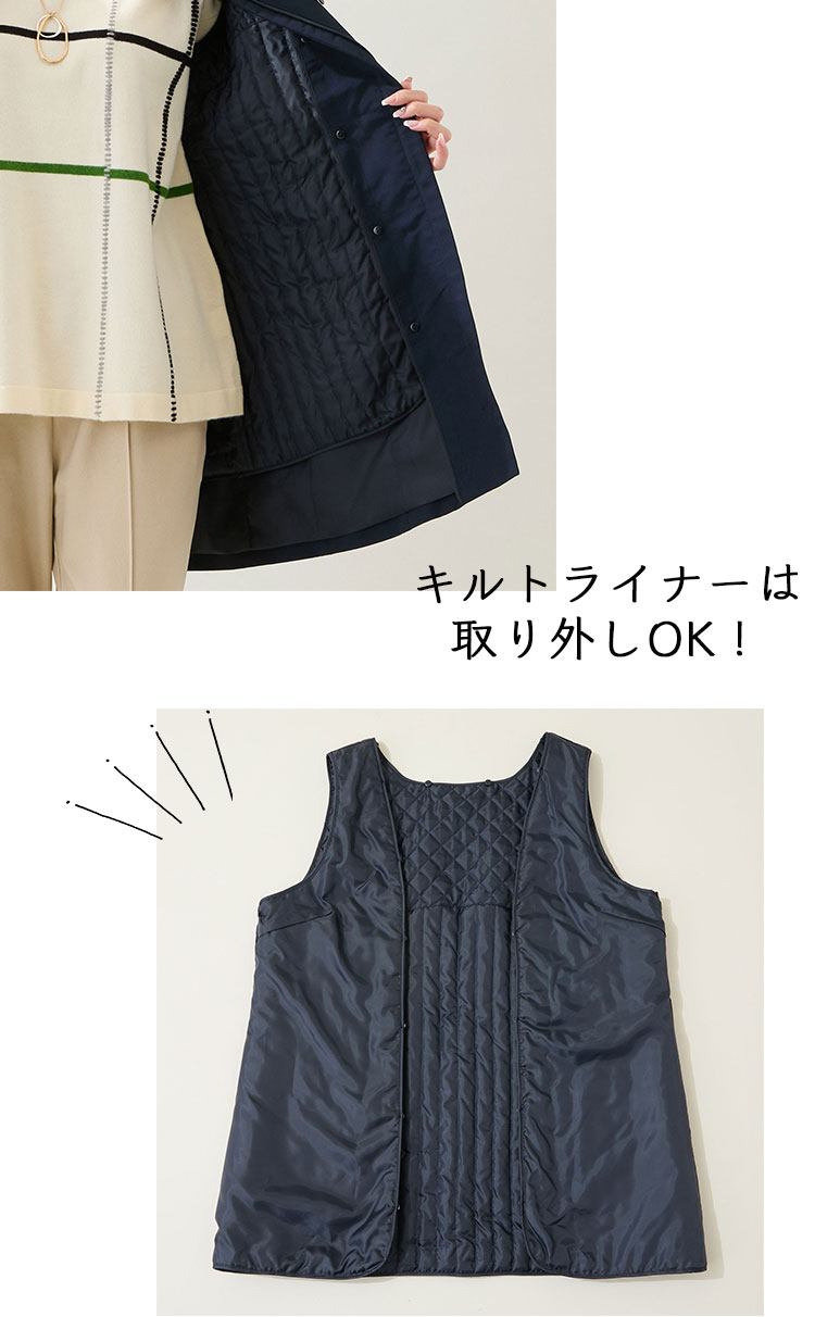 ややハリ感があり仕立て映えするグログランタフタを使ったコート。ライナーベストつきで寒さの残る春までロングシーズン活躍してくれます。