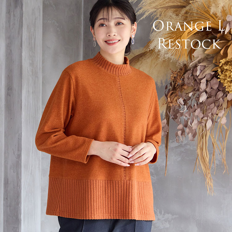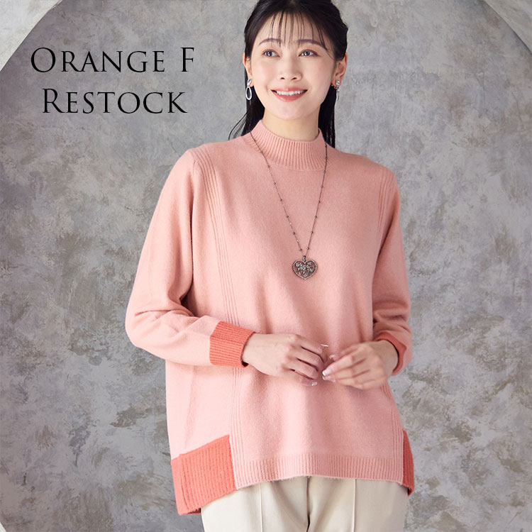 ソフトタッチで毎日着たくなるバイカラーセーター。完売していたオレンジのFサイズが再入荷しました。きれいなカラーでコーディネートがぱっと華やぐ一枚です。