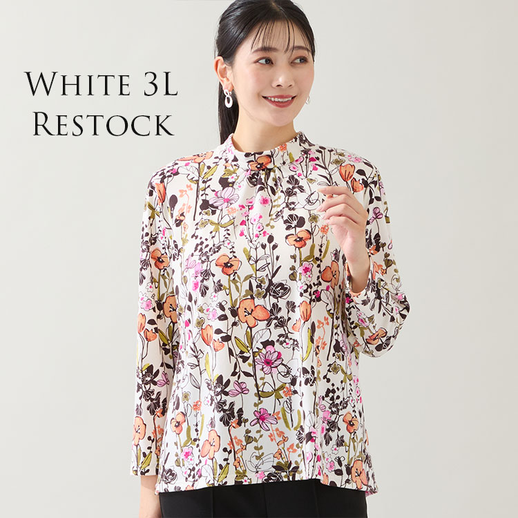着こなしがぱっと華やぐ柄トップスも大人気!ホワイトの3Lサイズが再入荷しました。一枚でも、コートインにも映える一枚です。