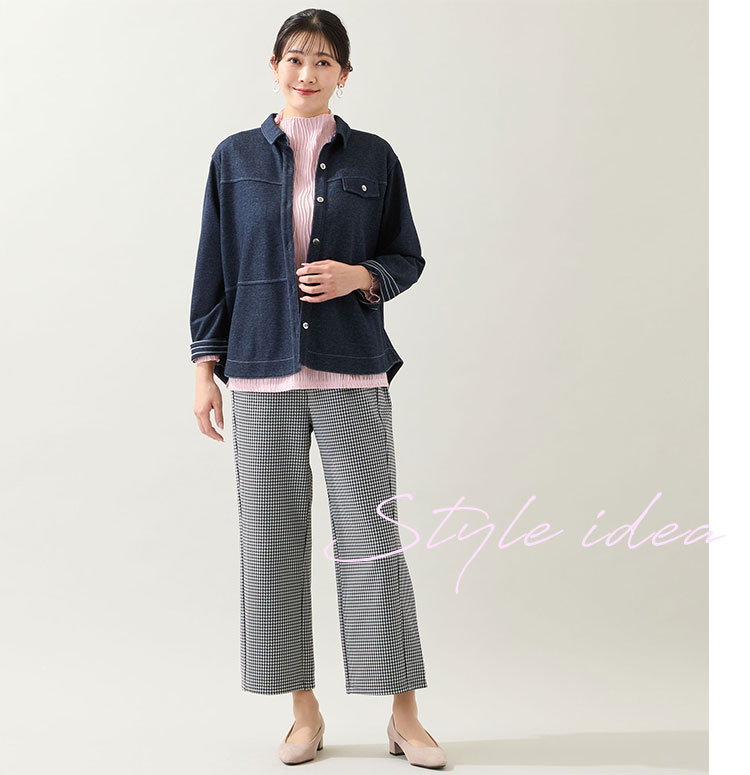 パンツはウエスト総ゴムのイージーパンツ。脚の形が出にくいワイドシルエットで動きやすくラクちんです。足首が見える丈で軽快に穿いていただけます。