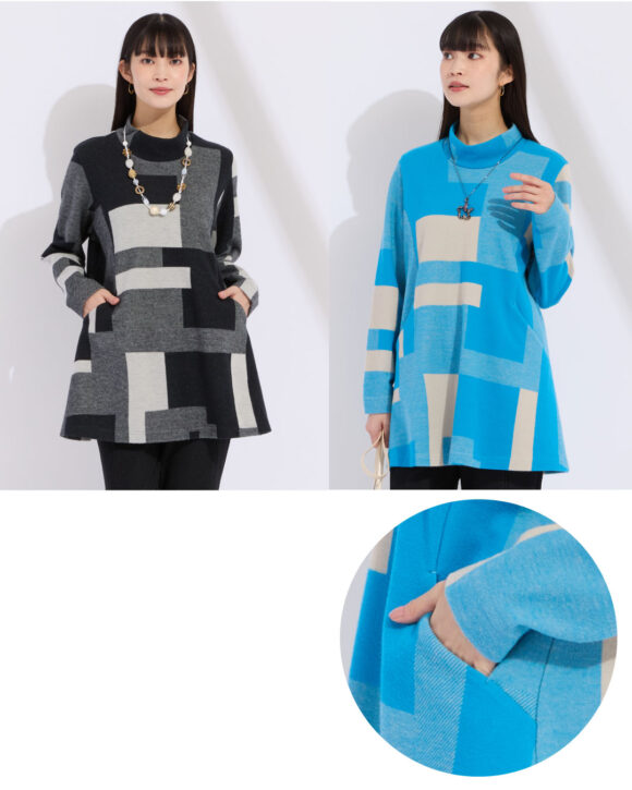 やわらかで肌触りの良い両面起毛素材。ハイネックで衿元をカバー。長めの着丈で腰回りも暖かく。寒い季節にも嬉しいウォーム感あるチュニックです。