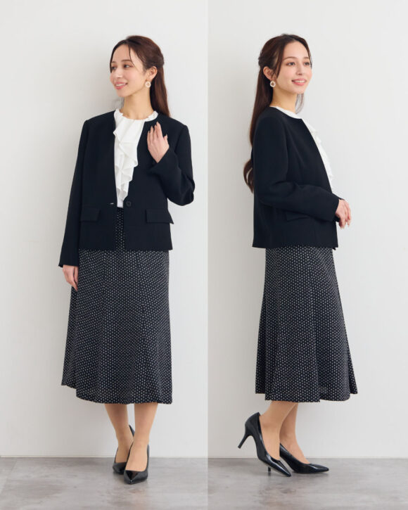 フォーマルシーンにも対応できる美しい黒。黒セットアップはブラックフォーマルにも対応可能。