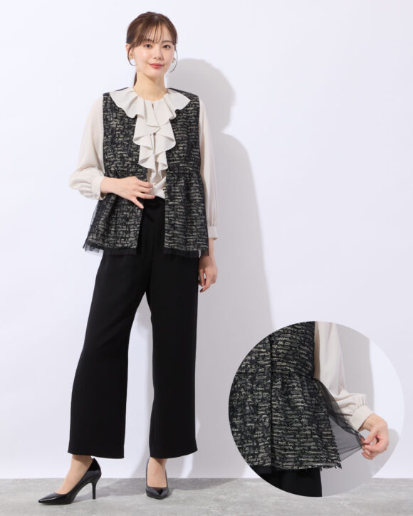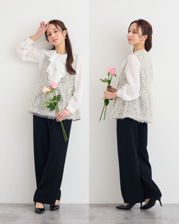 きれいめのパンツ、ブラウスと合わせれば、オケージョン・セレモニーシーンにぴったりのお洒落スタイリングに。