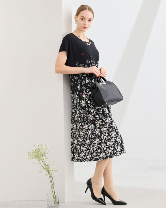 裾から吹き上げるように描かれた美しいプリントはリリアンビューティオリジナルのプリント。上品で品のあるワンピースです。