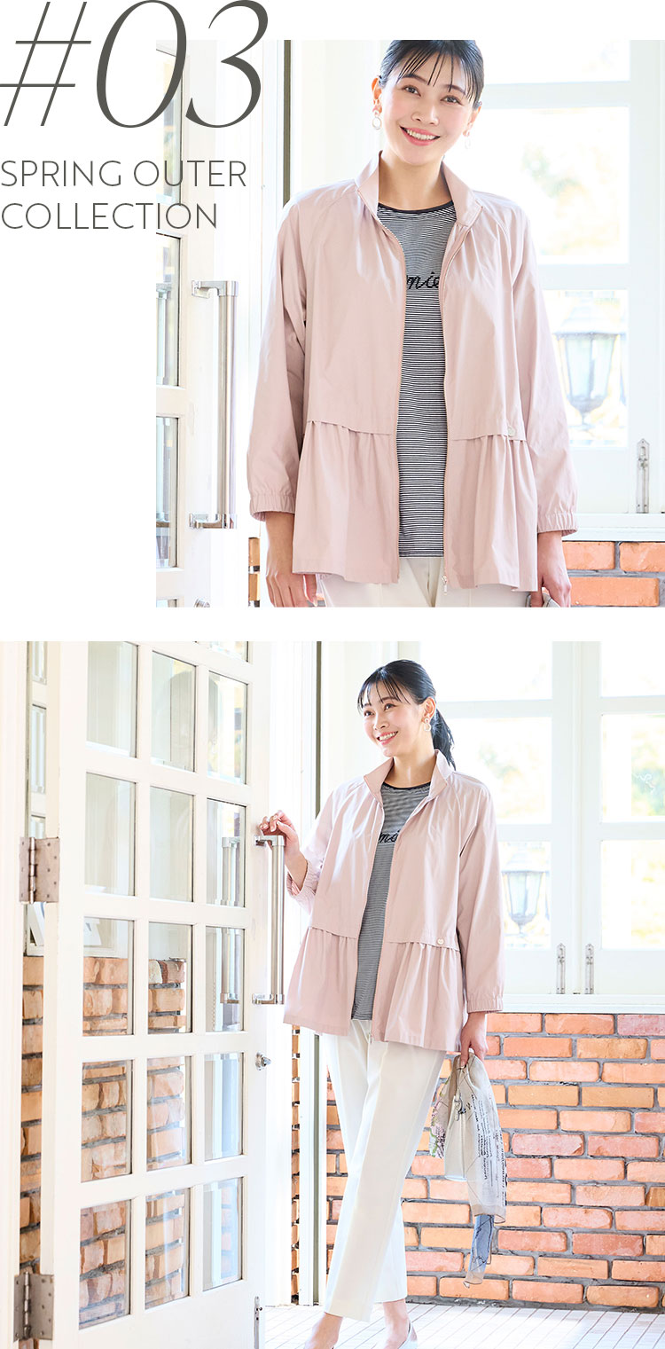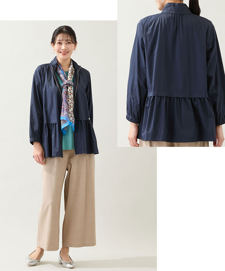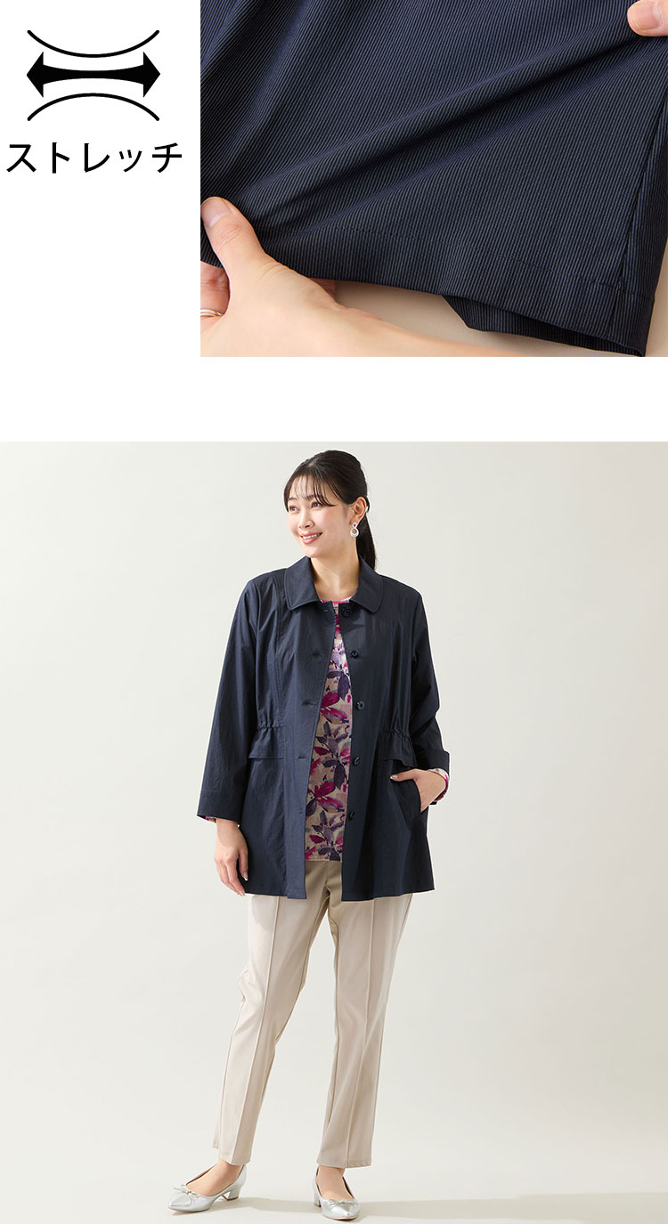こちらは高いストレッチ性で動きを邪魔せず軽快に羽織れるスプリングアウター。薄手で程よいハリ感があり、きれいなシルエットが自慢です。