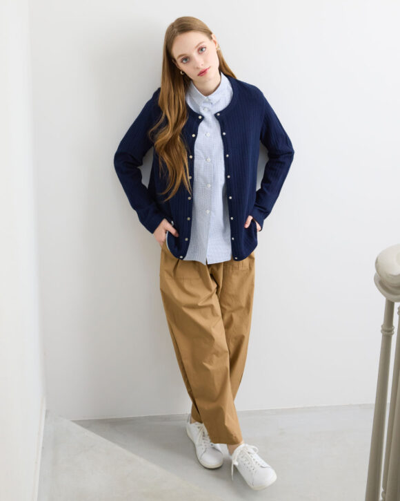程よい肉感があるカットソー素材のカーディガン。柔らかでストレッチもあり手洗いも可能なイージーケア。へリンボン模様のジャカード素材は日本の素材を使用しています。。