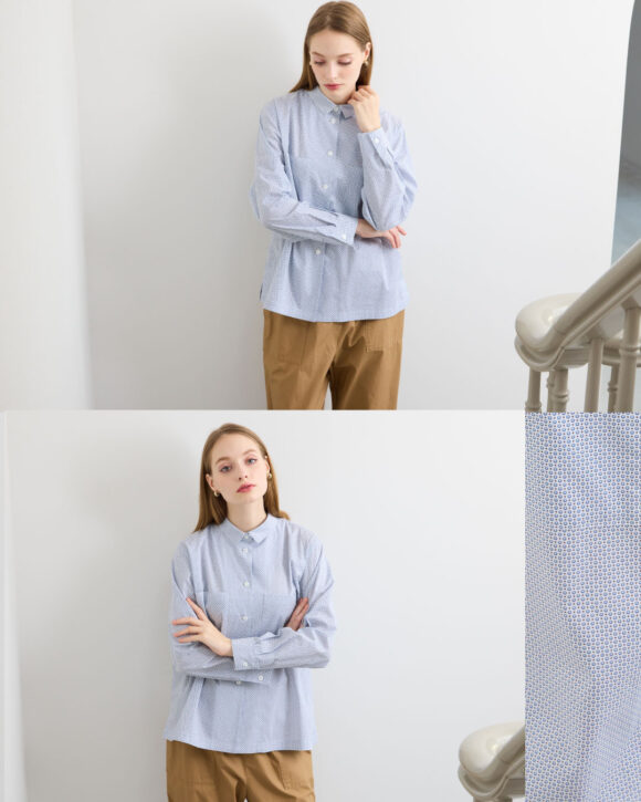 左右に胸ポケットが付いたブラウス。二色の小さな水玉がかわいらしいインポート素材。