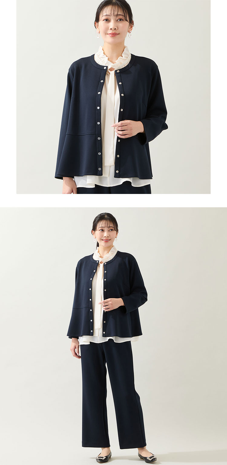 柔らかくストレッチ性抜群の人気素材を使ったセットアップスタイルがこちら!ジャケットはカーディガン感覚で軽快に羽織っていただけ、メタルボタンがさり気ない輝きを添えてくれます。