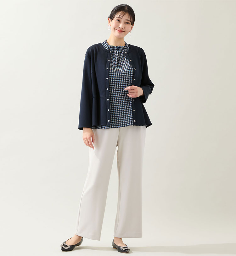 ボトムのカラーを変えれば軽やかな印象に。パンツはラクに穿けてきれいに見える人気アイテム。脚の形が出にくく、太過ぎないシルエットが魅力です。