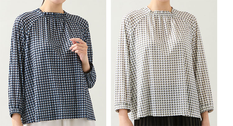 小ぶりの幾何柄がモダンなプリントトップス。薄手で軽いカットソー素材なので着心地は抜群です。