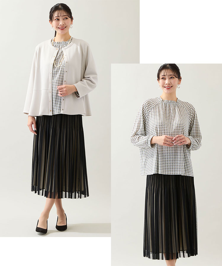 ジャケットはスカートとのコーディネートもお楽しみいただけます。揺れ感がきれいなプリーツスカートとならぐっとエレガントな印象に。