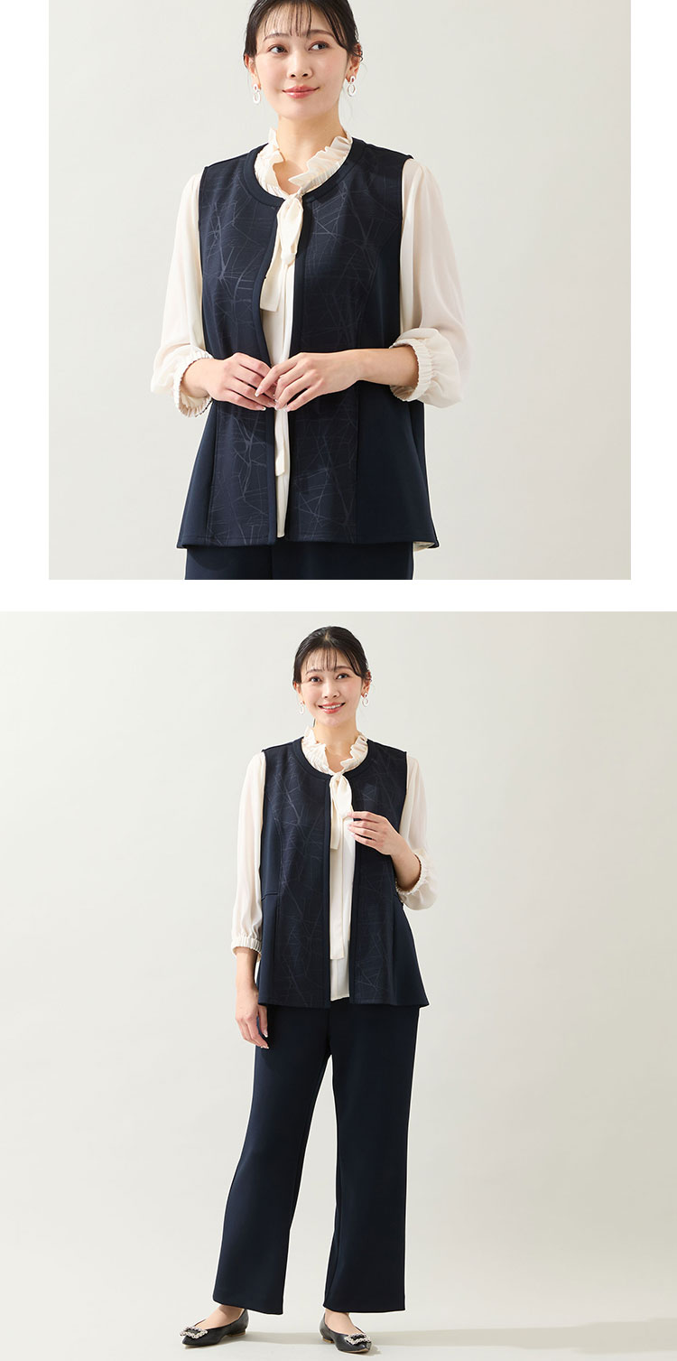 ベストはフロントにエンボス加工で柄を入れました。さり気ない陰影感がエレガンスムードを加速させます。