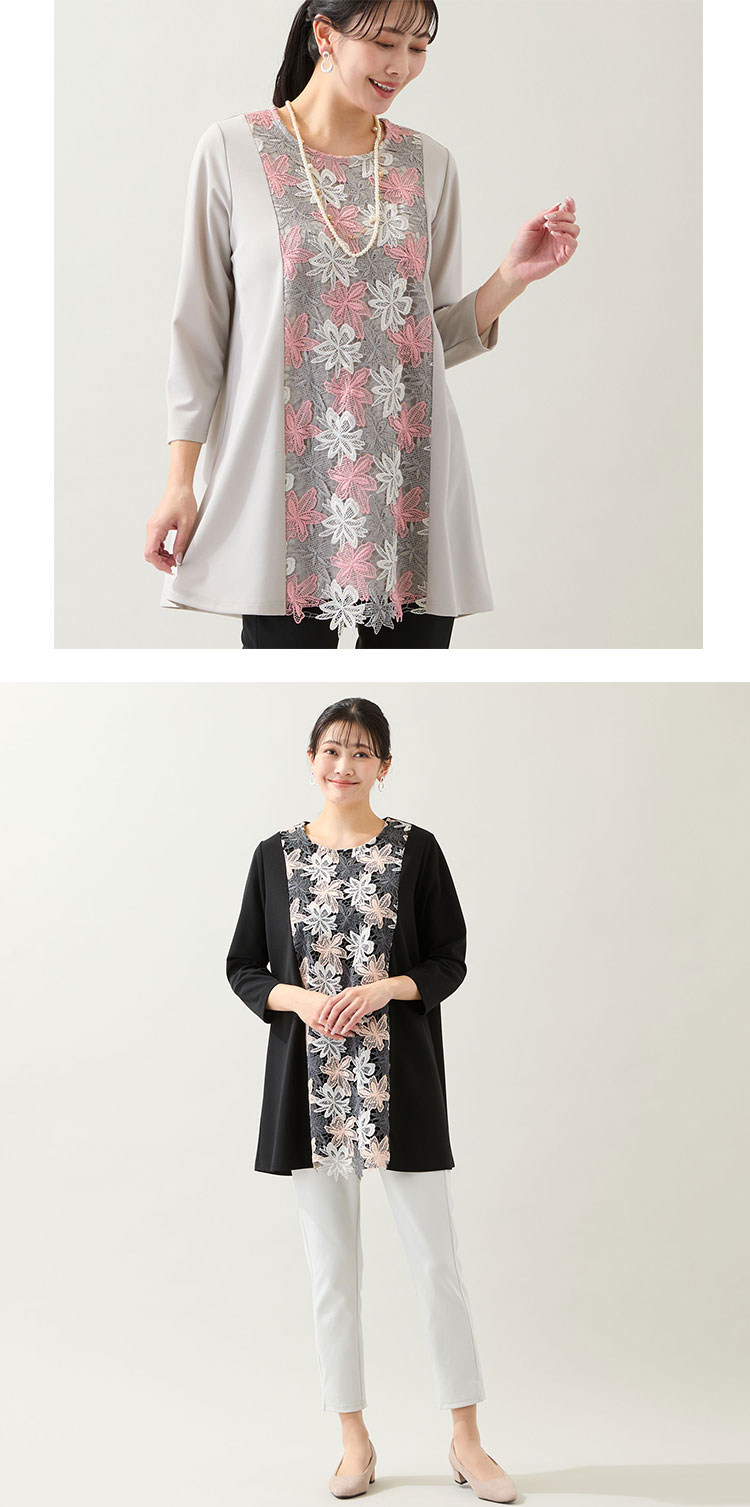 気になるお腹周りやヒップラインを隠せるエレガンスチュニックはラージサイズ女性の頼れる味方。美しいレースを使った華やぎチュニックが新登場です。