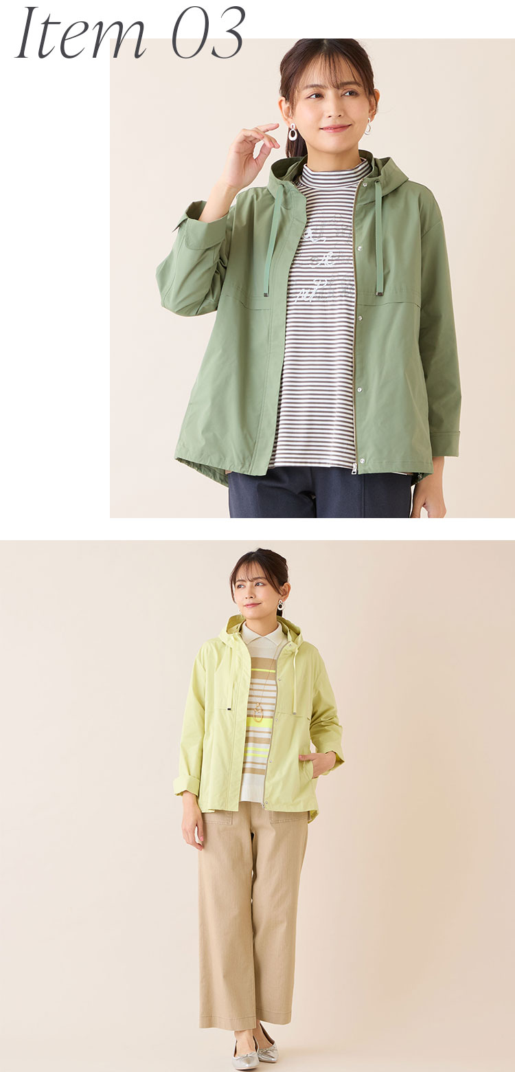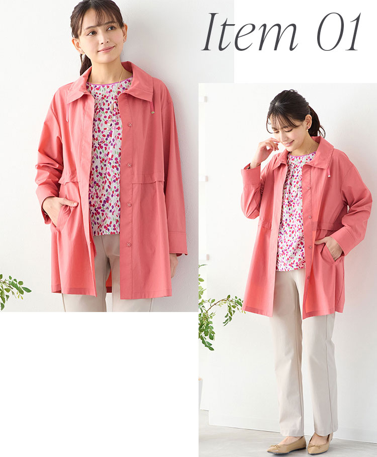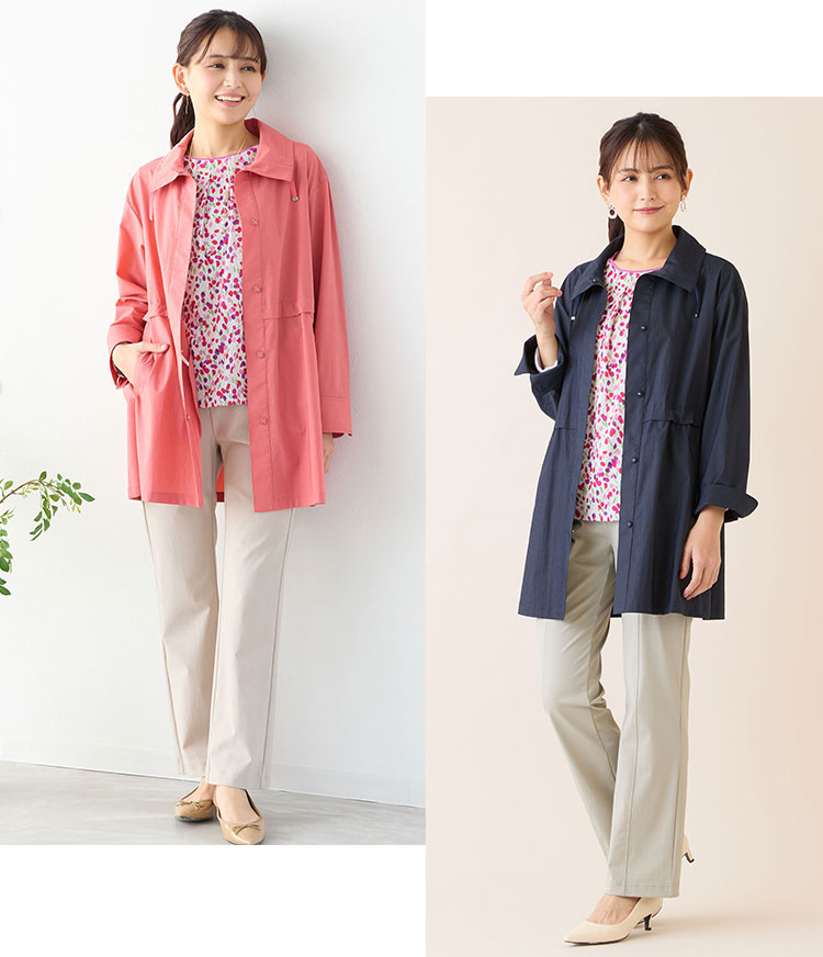 ウエストのドロストや小ぶりの襟元が女性らしさを演出。気軽に纏えるおすすめのアウターです。
