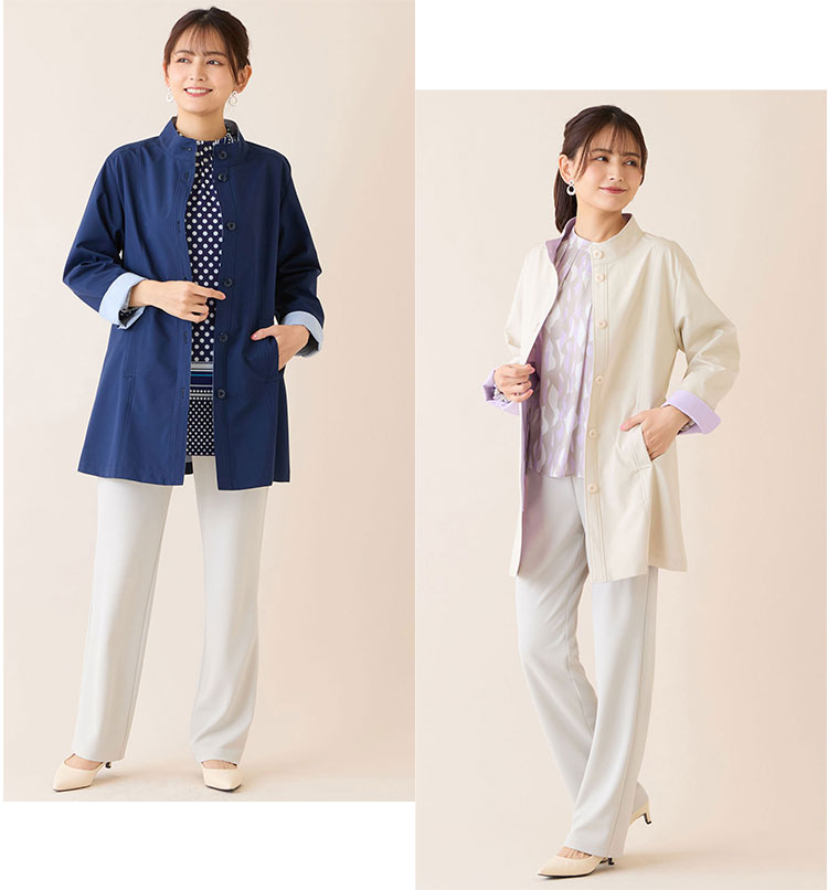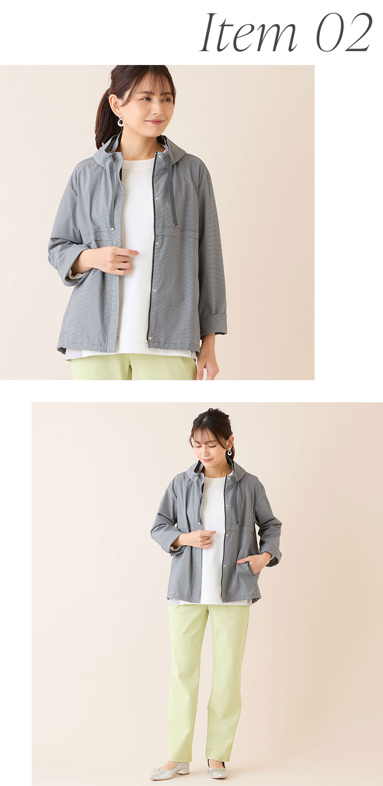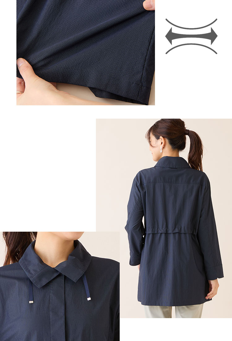 薄手で高いストレッチ性が特徴の国産素材を使用。細かいストライプ組織ですっきりとした印象で羽織っていただけます。