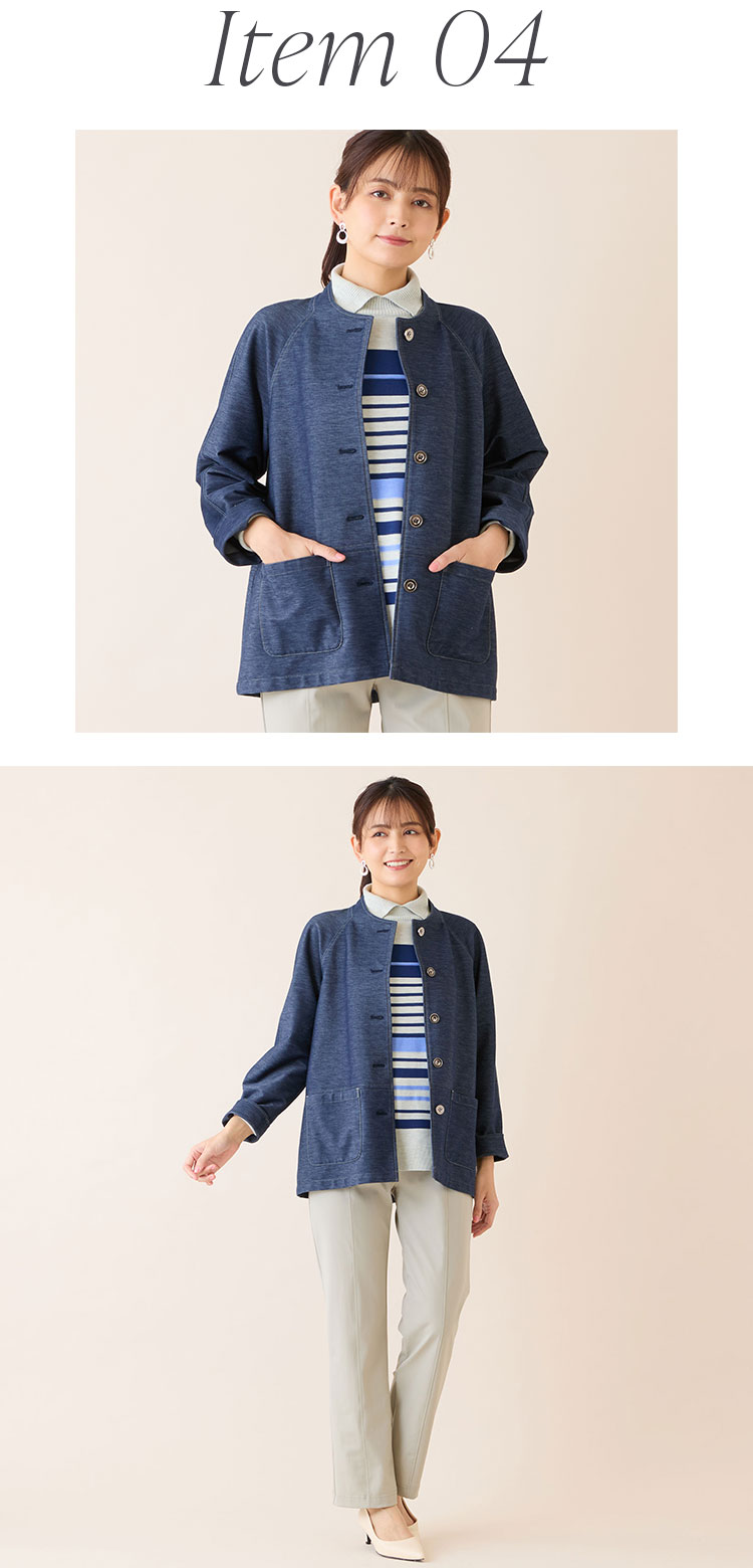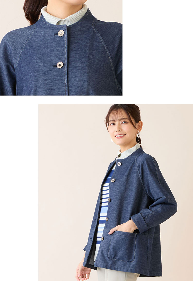 春に着たくなるデニム。柔らかくストレッチ性のあるデニム調のジャージー素材を使ったジャケットが新登場!程よい肉感があり、寒さの残る春先から即戦力になってくれる一枚です。