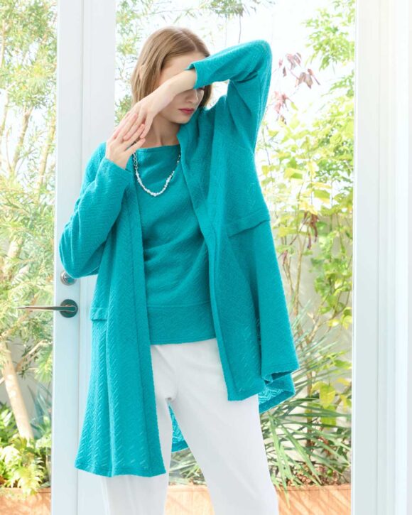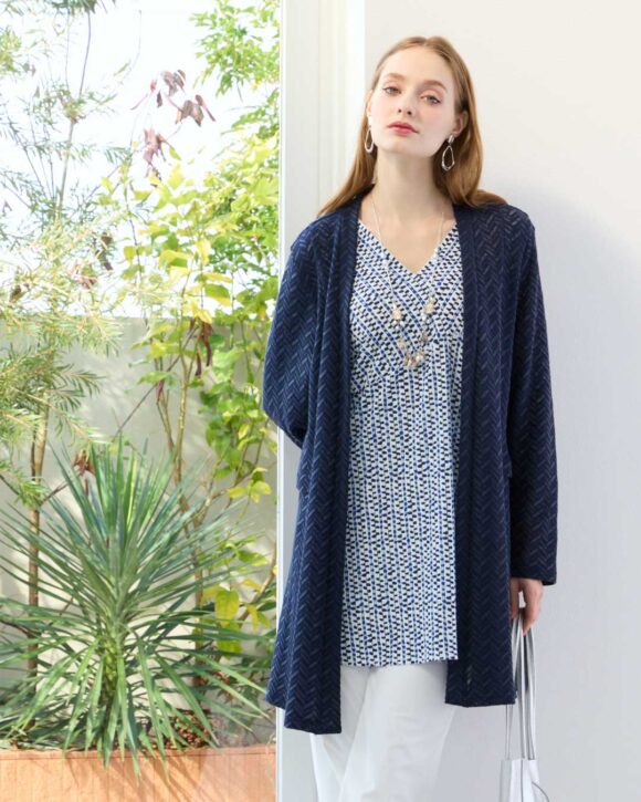 こちらは色違いのカーディガン。プリントチュニックにさっと羽織るのもエレガントで素敵。