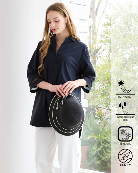 接触冷感・紫外線防止・ストレッチ・はっ水・遮熱性 充実した機能を持ち合わせた素材を使用。
