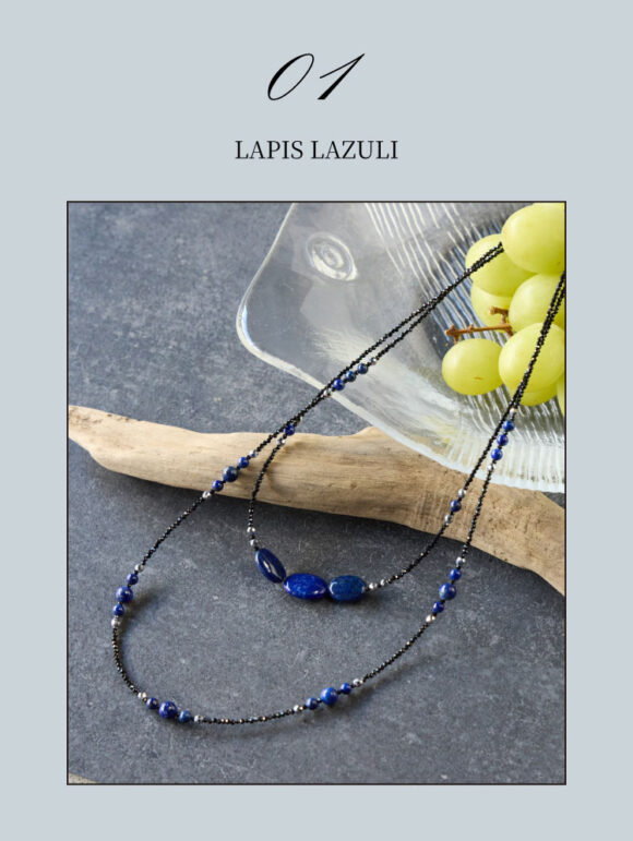 瑠璃色と漆黒、二つの美しい輝きが響きあう二連のネックレス。深みのあるラピスラズリと細やかな輝くを放つブラックスピネル。このバランス感が絶妙。