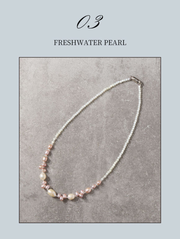 一粒一粒、色・形が異なる淡水パールとシェルを贅沢に連ねた大人のためのコンテンポラリーネックレス。