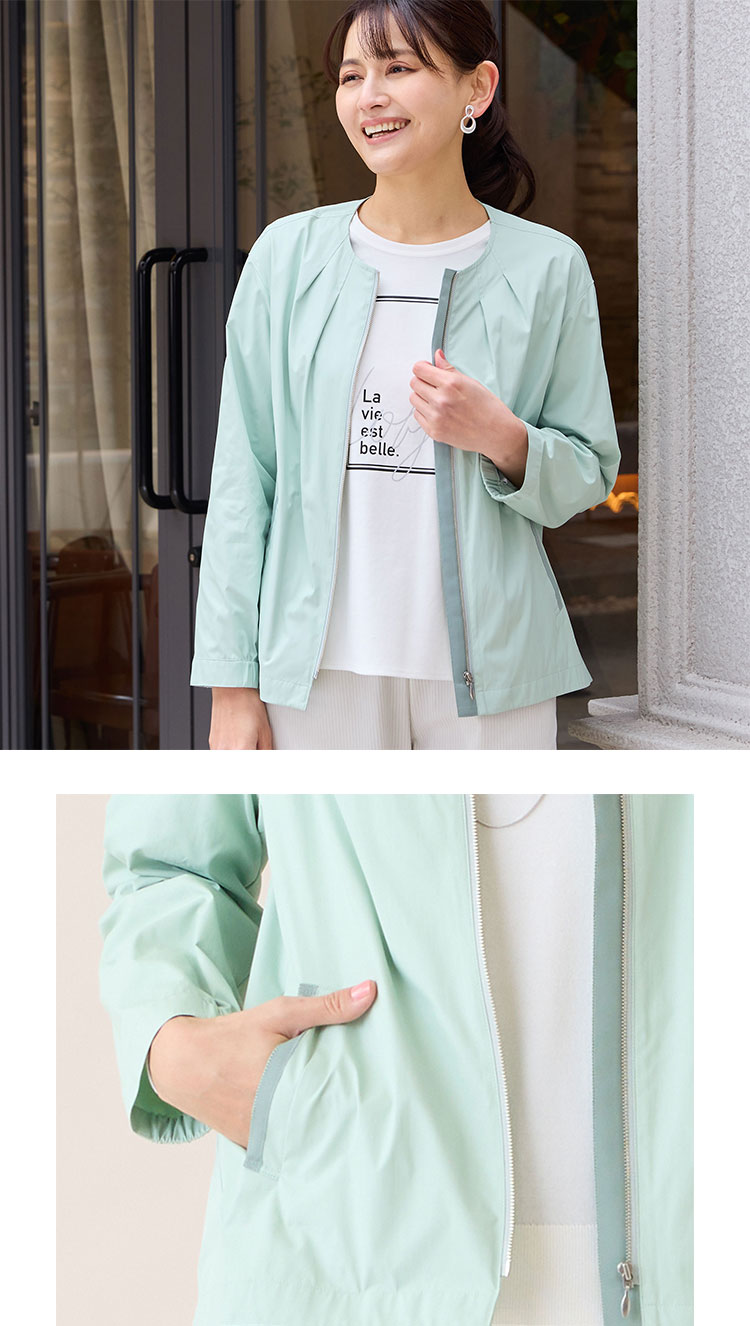 襟ぐりのタックや袖口のギャザーが女性らしい印象を与えてくれるノーカラージャケット。前端やポケット口のグログランリボンがさり気ないポイントです。