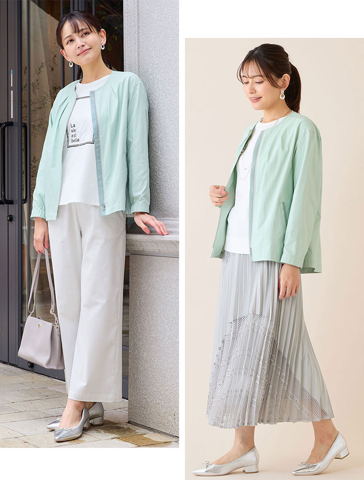 春らしいペールグリーンのほか、着まわせる定番人気のダークブルーもご用意しております。