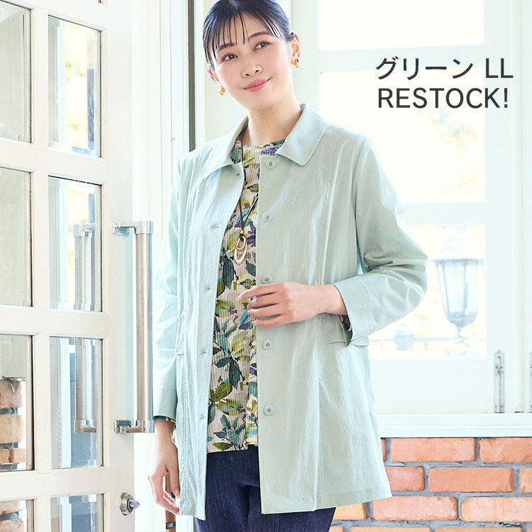 高いストレッチ性と軽さが魅力のスプリングコートがこちら。春にピッタリのきれいなグリーンがイチオシです。
