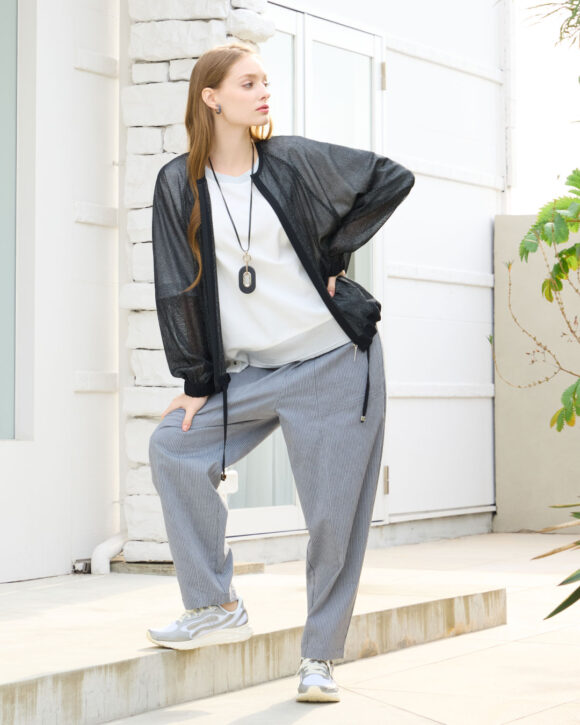 さりげないラメでクラス感アップ。カジュアルを格上げするライトアウタースタイルで颯爽と。