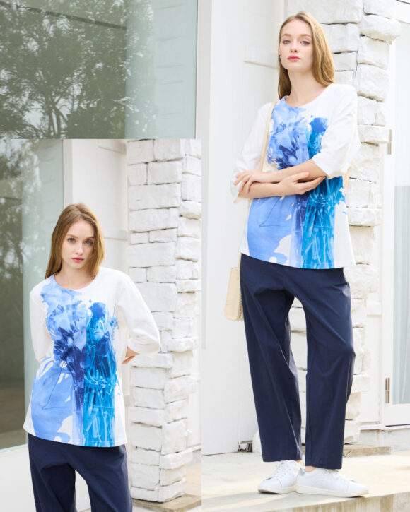 ブルーの陰影でのプリント。奥行きのある色使いが美しいTシャツです。