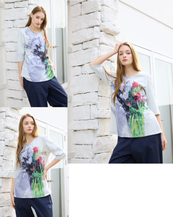 インナーにはブーケのフォトプリントTシャツ。カラー/モノトーンの陰影感あるプリントが映えます。